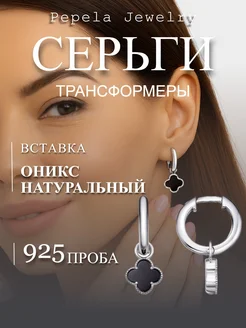 Серьги серебро 925 конго с подвесками клевер с ониксом