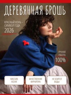 Конь красный деревянная брошь ручной работы