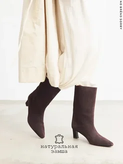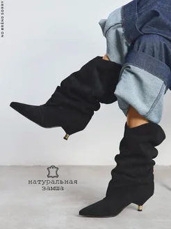 Сапоги трубы замшевые с острым носом на низком каблуке