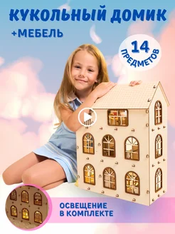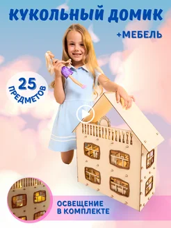 Деревянный кукольный домик с освещением и мебелью для Барби