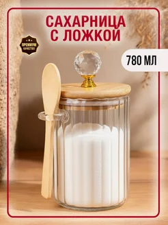 Сахарница с деревянной крышкой и ложкой стеклянная