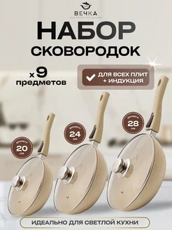 Набор бежевых сковород 20 см, 24 см, 28 см с крышками