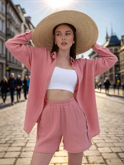 Костюм летний с шортами и рубашкой муслин "Розовый персик"
