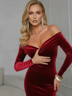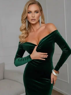 Бархатное платье миди вечернее со спущенными плечами