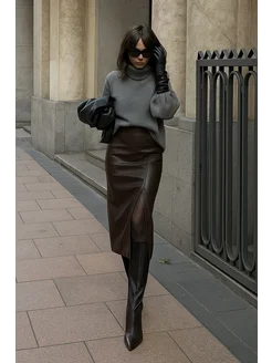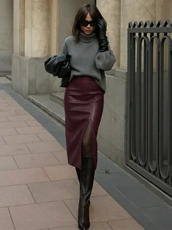 Юбка кожаная карандаш миди с разрезом