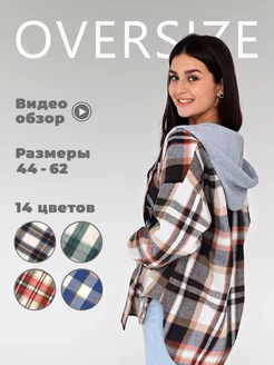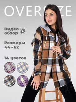 Удлиненная теплая рубашка оверсайз в клетку с капюшоном