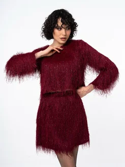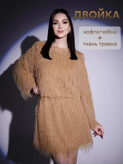 Вечерний костюм пушистый двойка кофта с юбкой из травки
