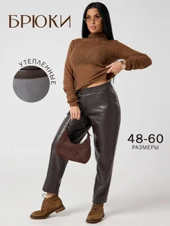 Кожаные брюки женские утепленные коричневые большие размеры