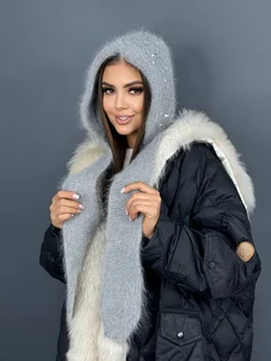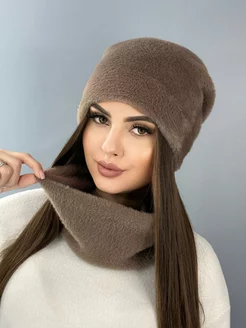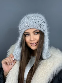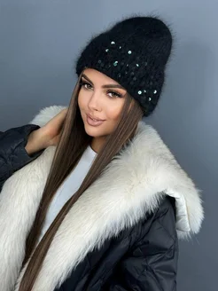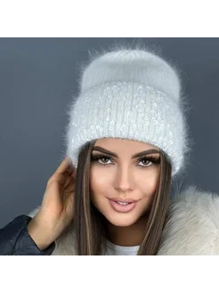 шапка чепчик с завязками из ангоры теплый с пайетками