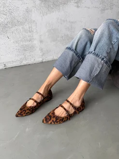 Леопардовые балетки на каблуке с ремешком с острым носом