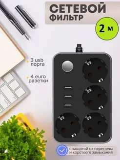 Удлинитель 2 метра с 3 usb 4 розетки