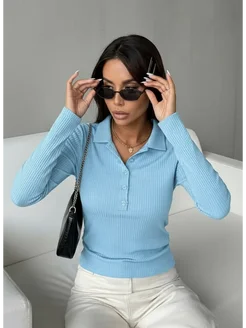 Лонгслив поло облегающий в рубчик с длинным рукавом