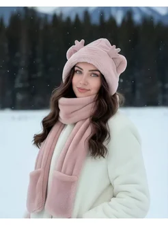Шапка y2k с ушками шарфом и варежками теплая молодежная 3в1