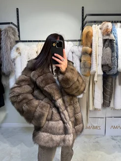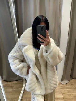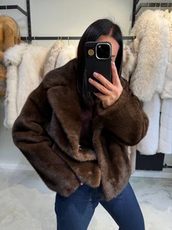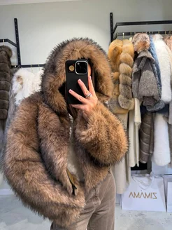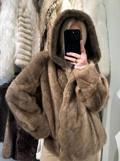 Укороченная зимняя шуба из эко-меха с капюшоном