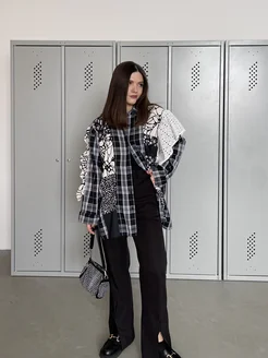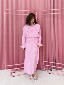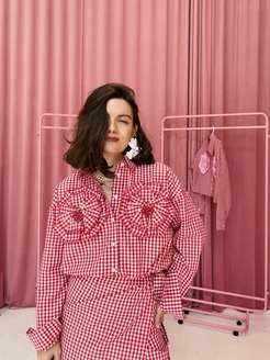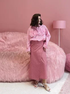 Рубашка в розовую клетку укороченная с розовыми цветами