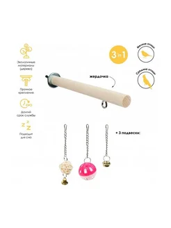 Жердочка для птиц прямая с 3 игрушками, размер S 15x2x2 см