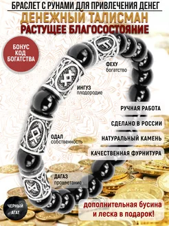 Браслет из черного агата со скандинавскими рунами феху