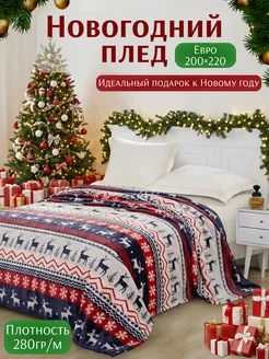 плед 200х220 см, новогодний, с оленями велсофт евро теплый