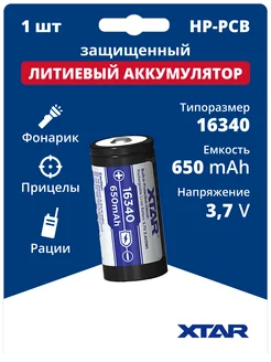 Аккумулятор 16340 Li-ion, литий-ионный АКБ 3.7V 0,65Ач 1,95A