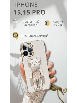 Чехол белый на iphone 15 pro с подставкой c мишкой bearbrick