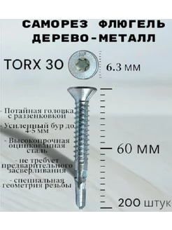 Саморез Флюгель дерево-металл 6.3*60 мм Torx 30 со сверлом
