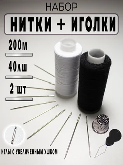 нитки швейные набор 2 шт. черные и белые с иголками