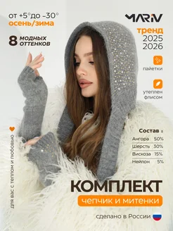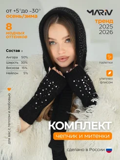 Чепчик капор и митенки комплект вязаный на флисе