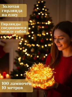 Золотая гирлянда на елку новогодняя электрическая 10 метров