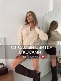 Свитер оверсайз укороченный теплый с воротником поло косичка
