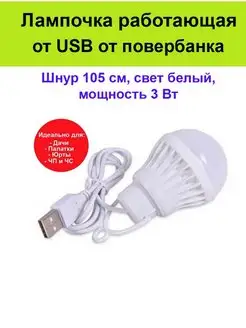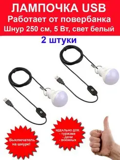 Лампочка USB, 5 Вт работает от повербанка шнур 250 см - 2 шт
