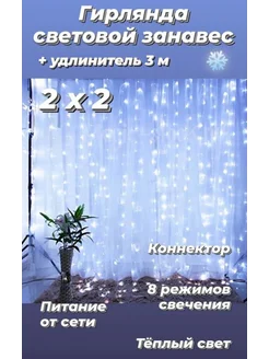 Светодиодная гирлянда штора занавес белая 2 на 2