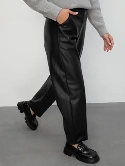 Брюки прямые зауженные кожаные на резинке