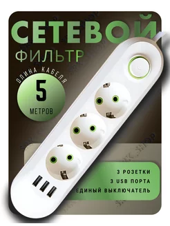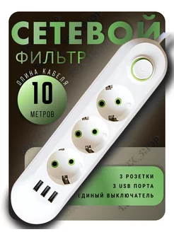 Сетевой фильтр 10 метров 3 розетки 3 USB