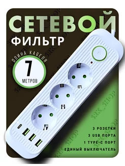 Сетевой фильтр 7 метров 3 розетки 3 USB Type-C