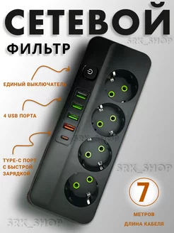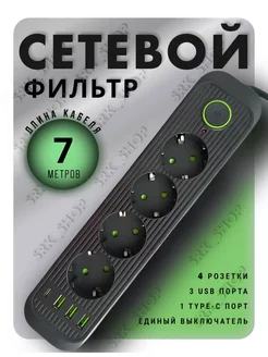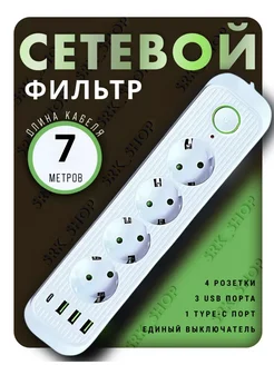 Сетевой фильтр Type-C 7 метров 4 розетки 3 USB