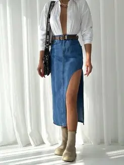 Юбка джинсовая женская миди длинная с разрезом спереди сбоку