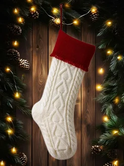 Большой новогодний вязаный носок для подарков на камин