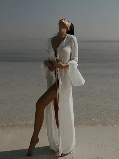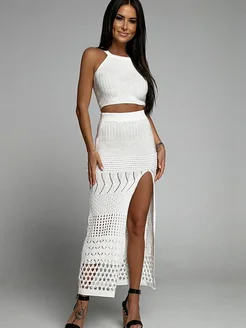 Вязаный пляжный костюм из топа и длинной юбки белый
