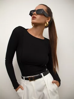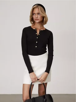 Лонгслив реглан с кнопками облегающий черный в рубчик