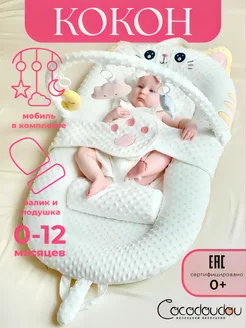 Кокон для новорожденных с мобилем, подушкой и валиком Котик
