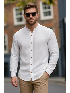 Рубашка муслиновая летняя с длинным рукавом воротник стойка