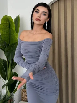 Платье длинное с открытыми плечами и разрезом