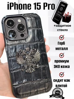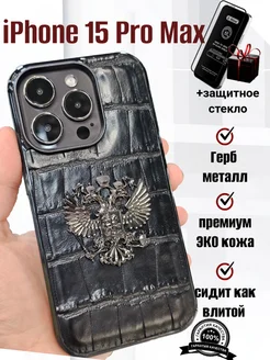 Чехол на iPhone 15 Pro Max с герб России кожа