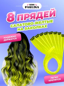 Цветные пряди на заколках для волос салатово-желтые, 8 штук