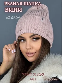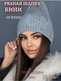 Шапка бини рваная вязаная