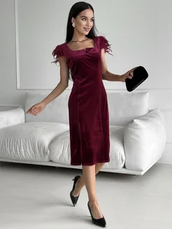 Платье новогоднее бархатное вечернее праздничное с перьями