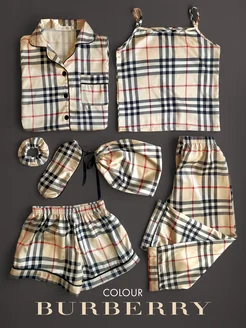 Пижама со штанами и рубашкой шелковая набор 7в1 в клетку
