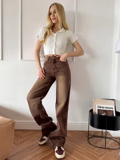 Джинсы трубы коричневые широкие с потертостями