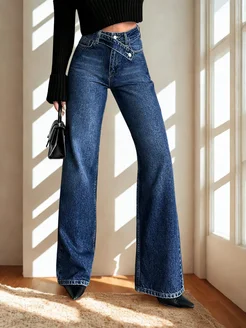 Джинсы прямые трубы с ассиметричным поясом широкие