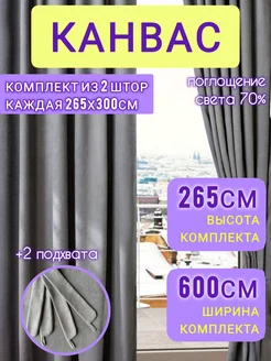 Шторы канвас серые 265*600 см с подхватами для спальни, зала